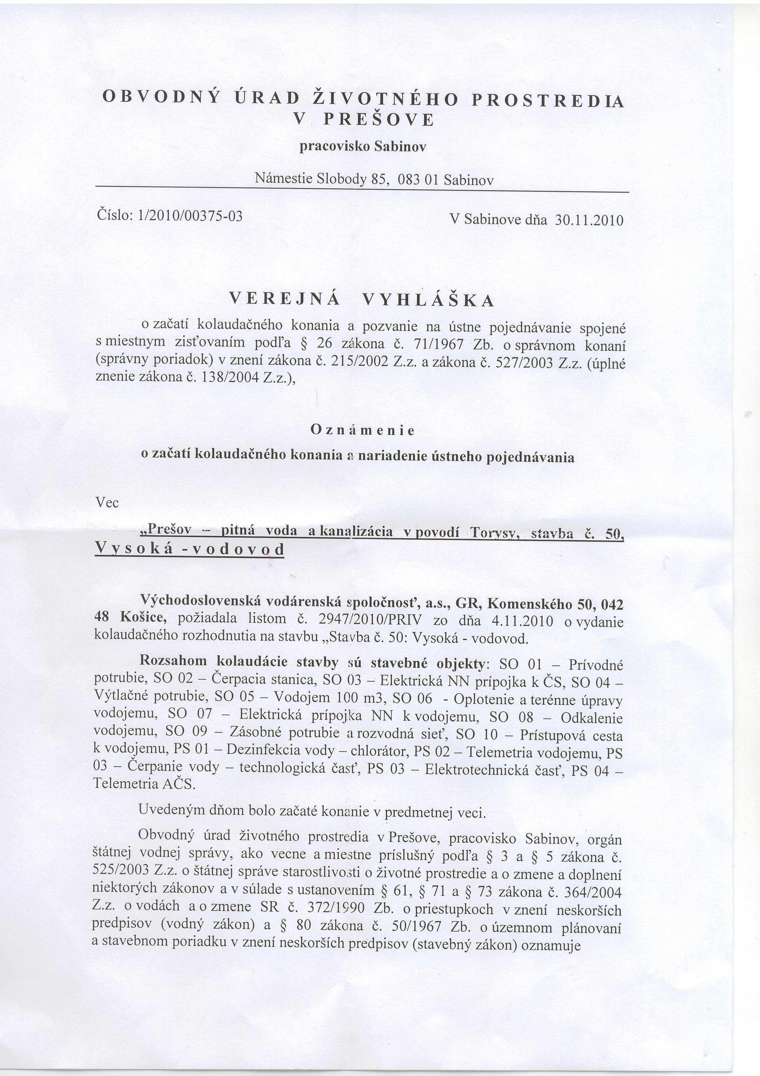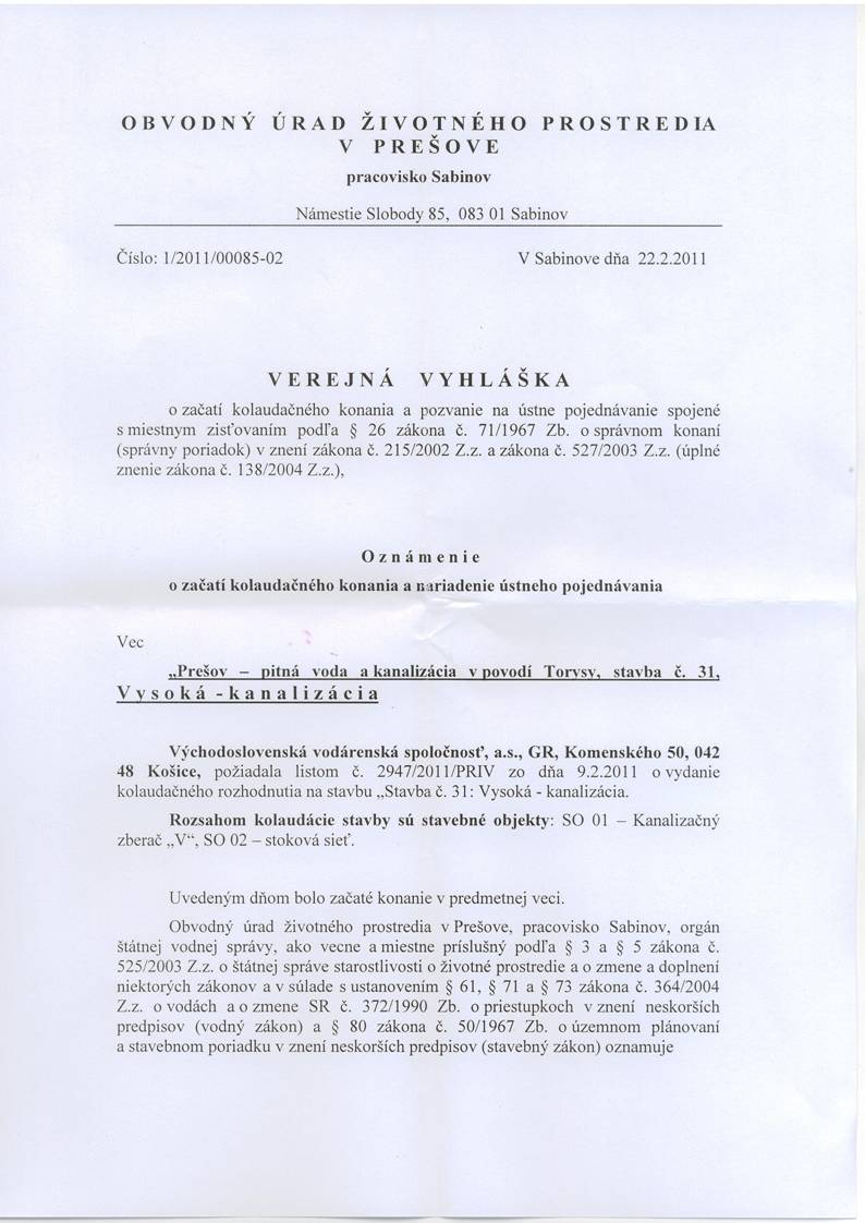 Oznámenie o začatí kolaudačného konania a pozvanie na ústne pojednávanie