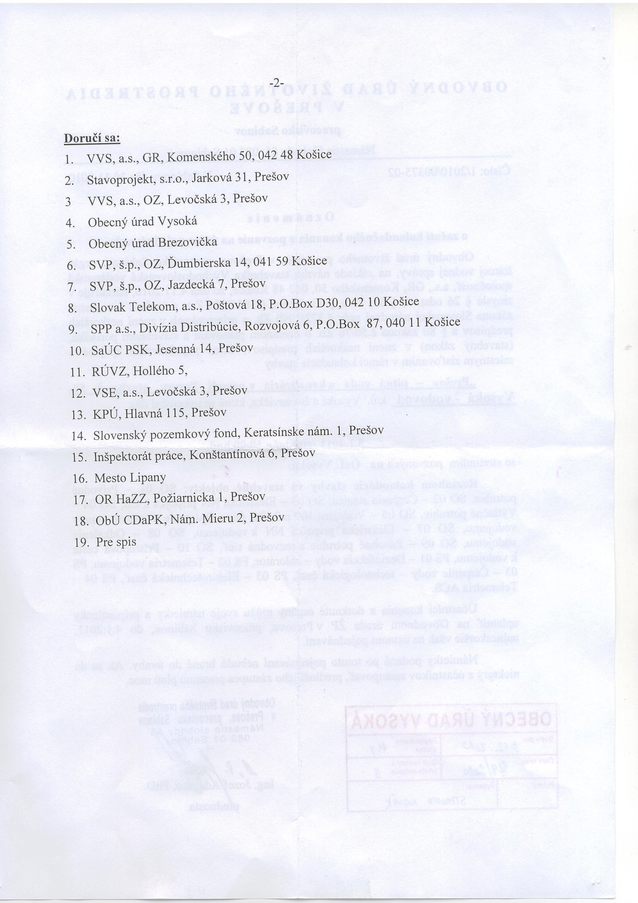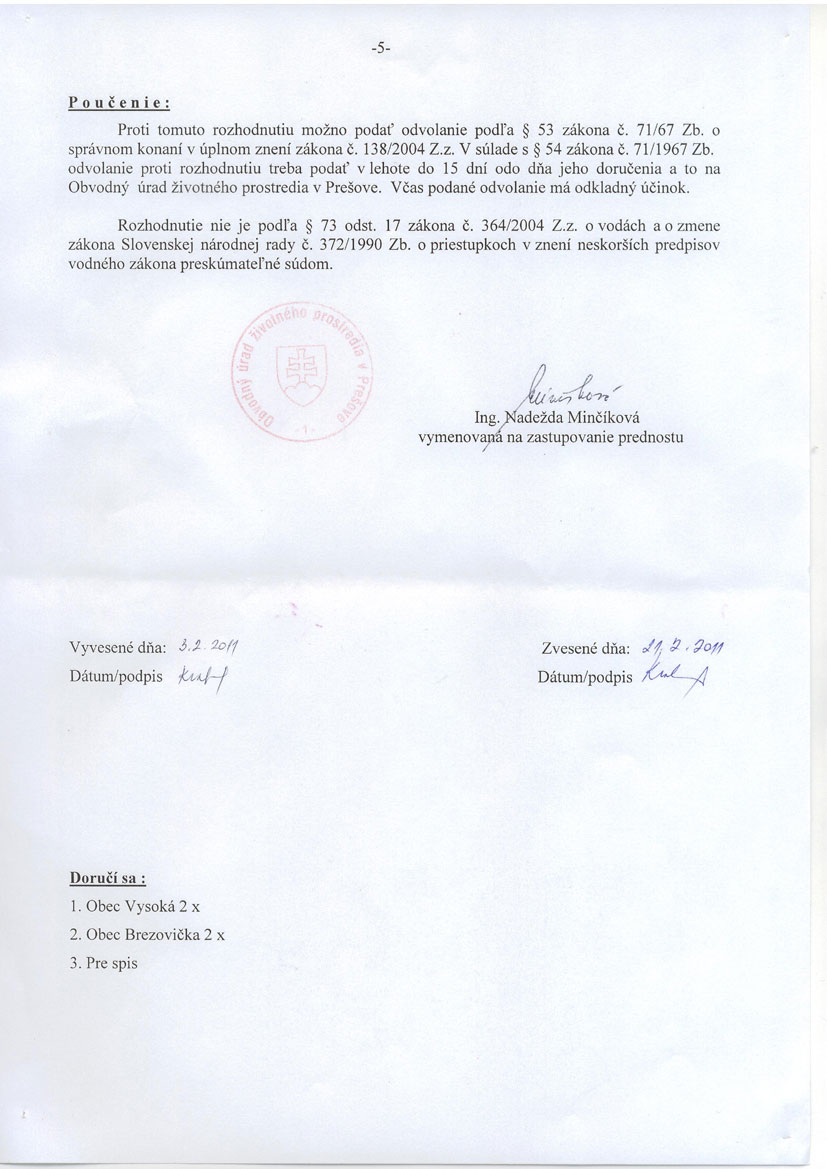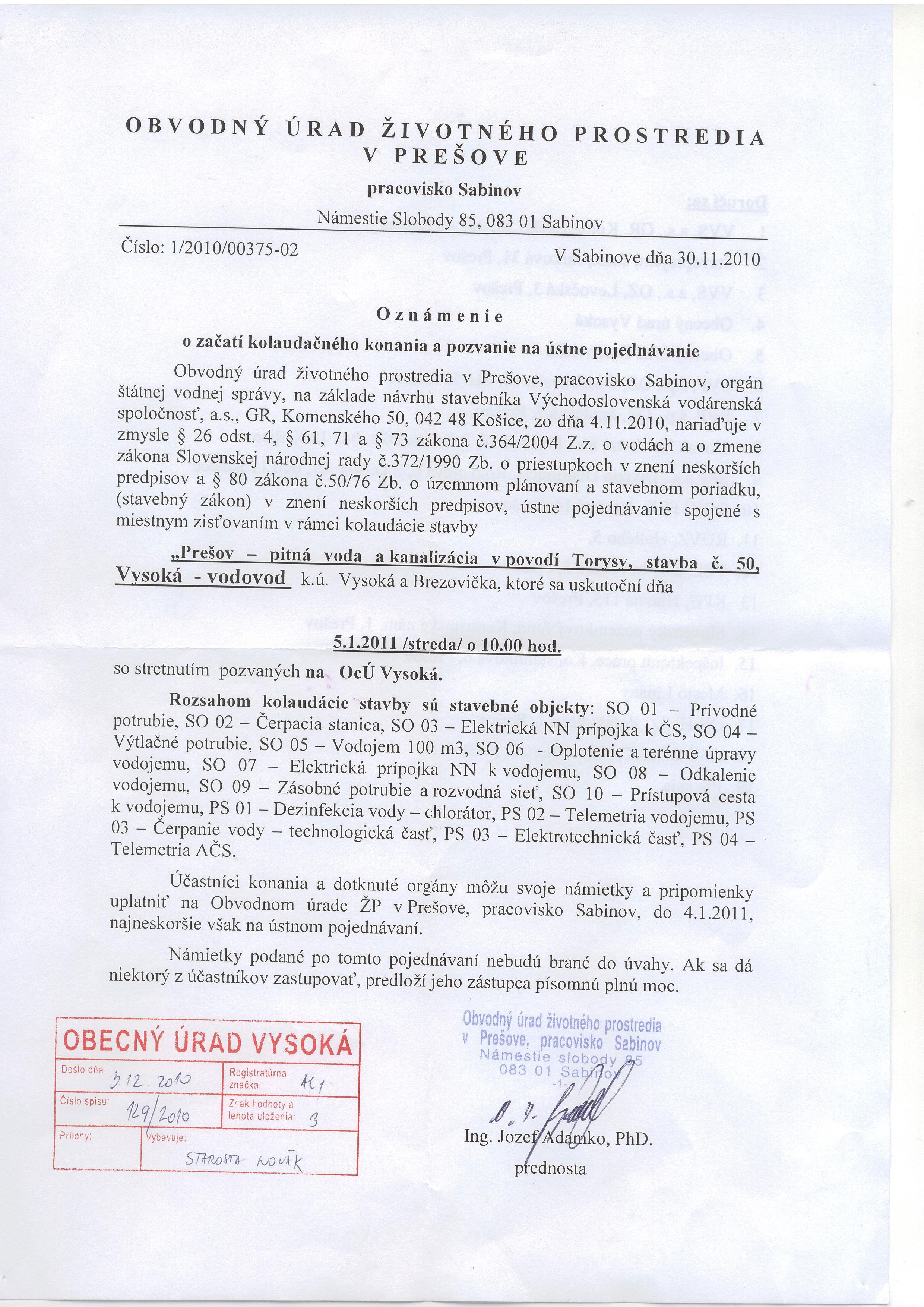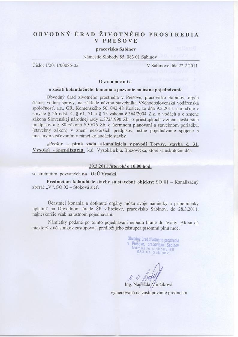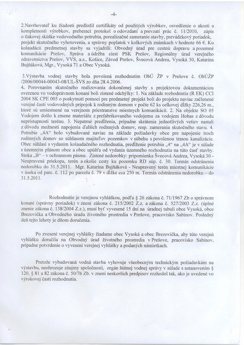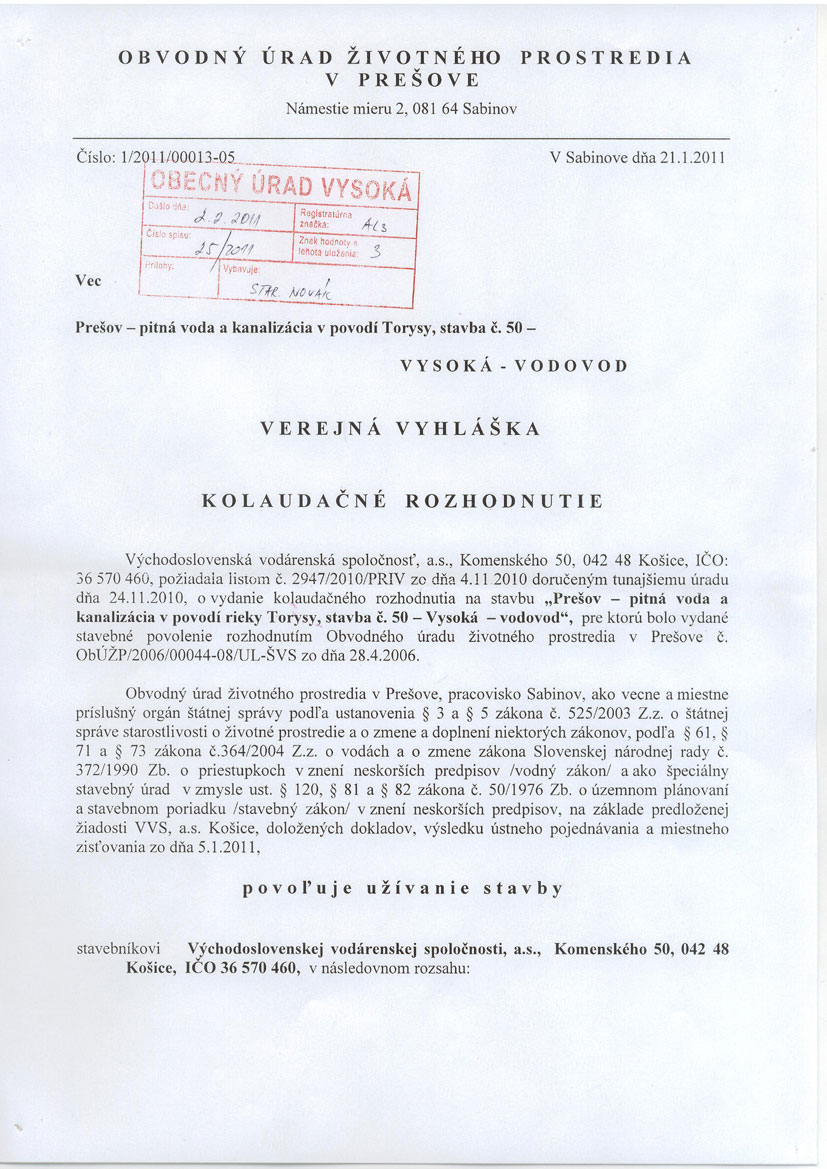 VYSOKÁ, oznam o kolaudácii vodovodu